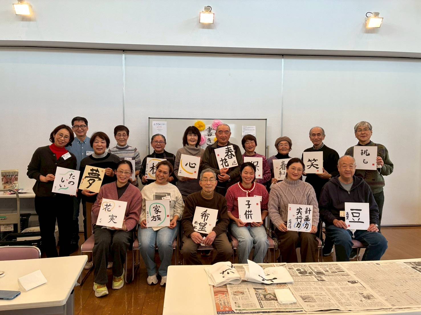 少しでも上手に書けると嬉しそうな学習者の顔、それを見るとボランティアの心も温まります。最後に、緊張しながら色紙に清書、ひとりずつ作品を持っての記念撮影。皆、満足顔で、イベント終了。