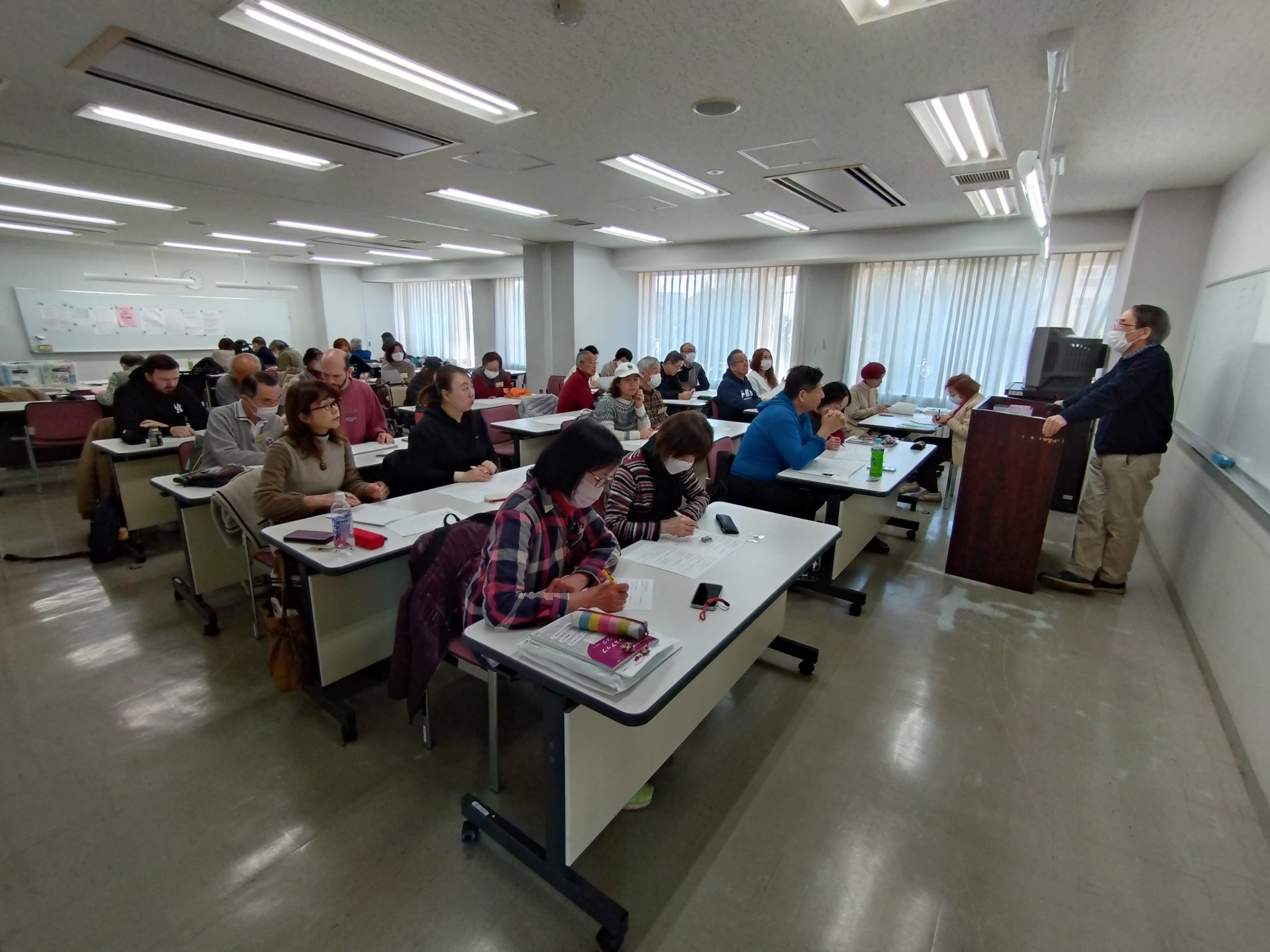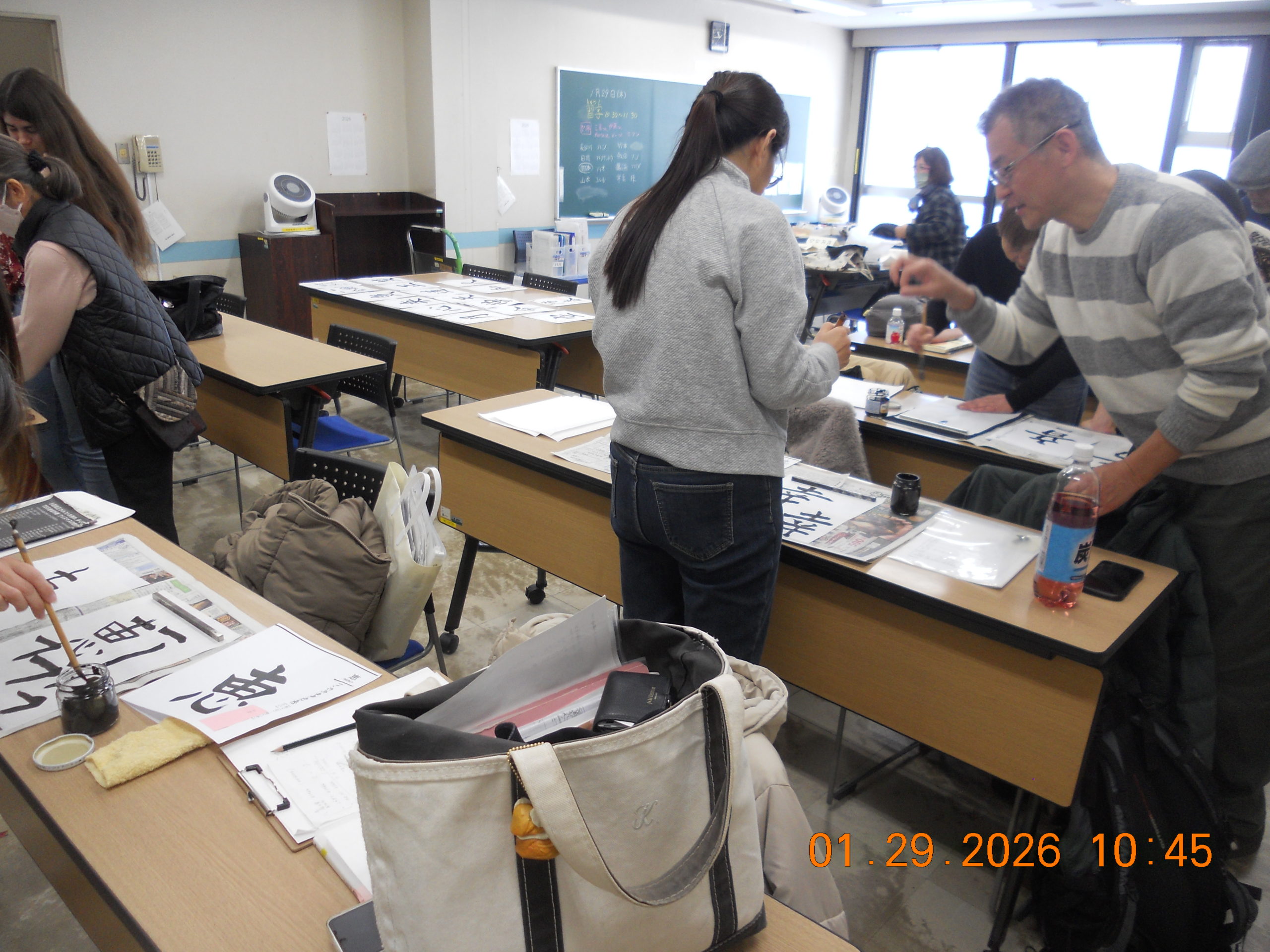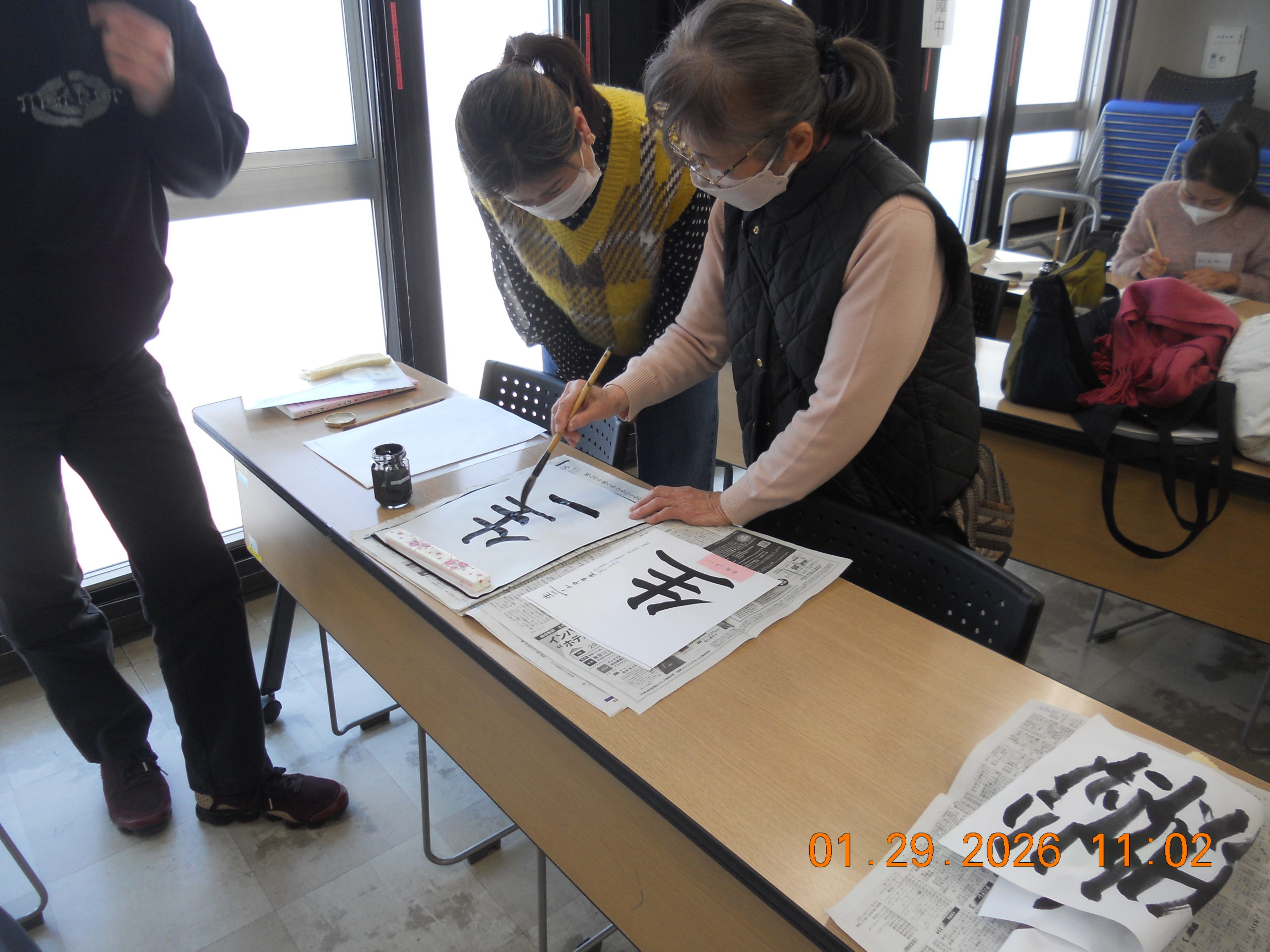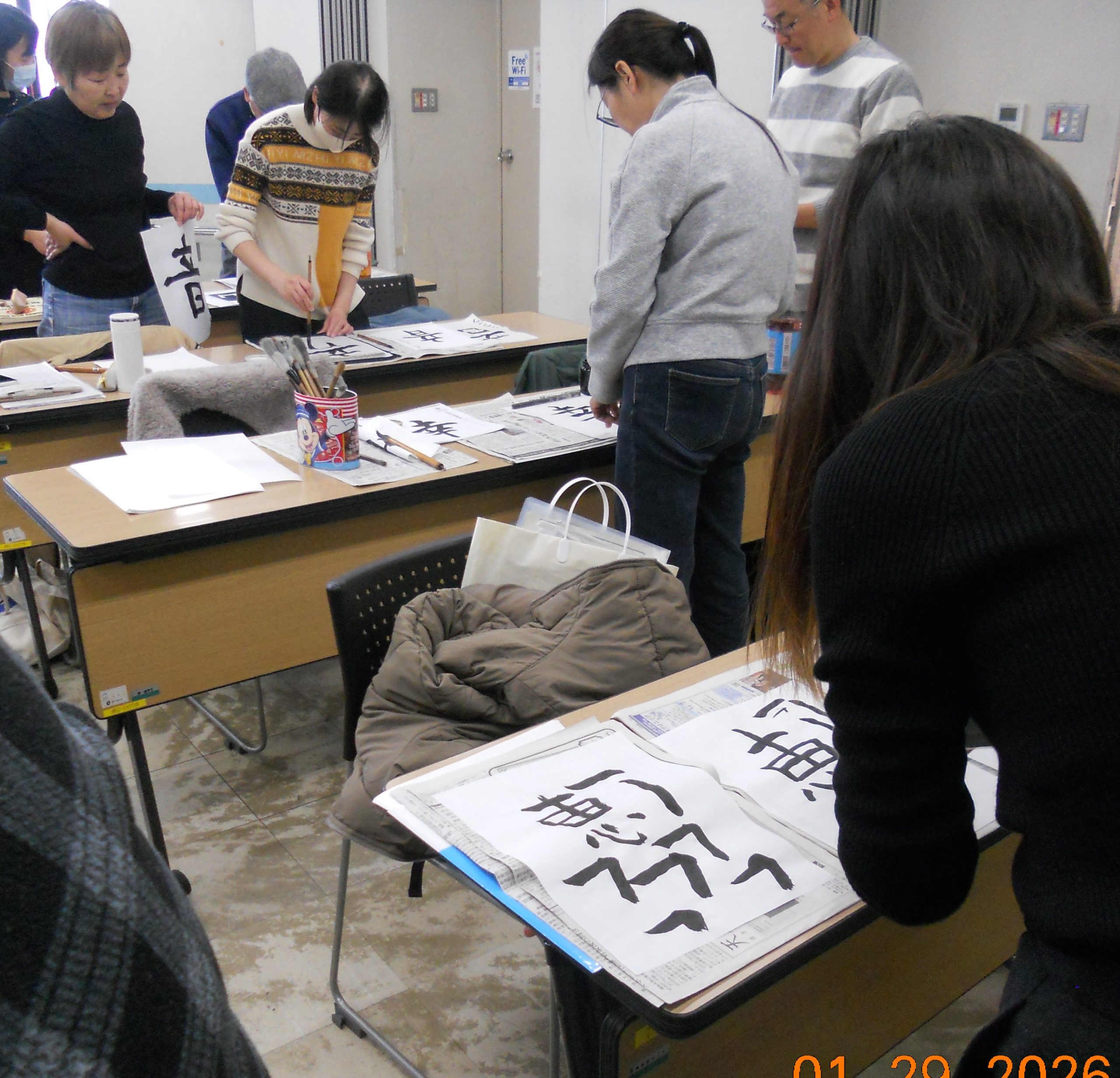 2026年1月29日、木曜クラスで、習字イベントを行いました。学習者7名、ボランティア10名が参加しました。漢字学習の一助にと始めた、お習字でしたが、ボランティアも含め、けっこう熱が入り、いつしか年始には欠かせないイベントになりました。ボランティアがサポートしながら、自分で決めたお手本を見て、半紙10枚位練習。その後、小筆で名前の練習。名前は漢字の人、カタカナの人、自由に書いてもらいました。