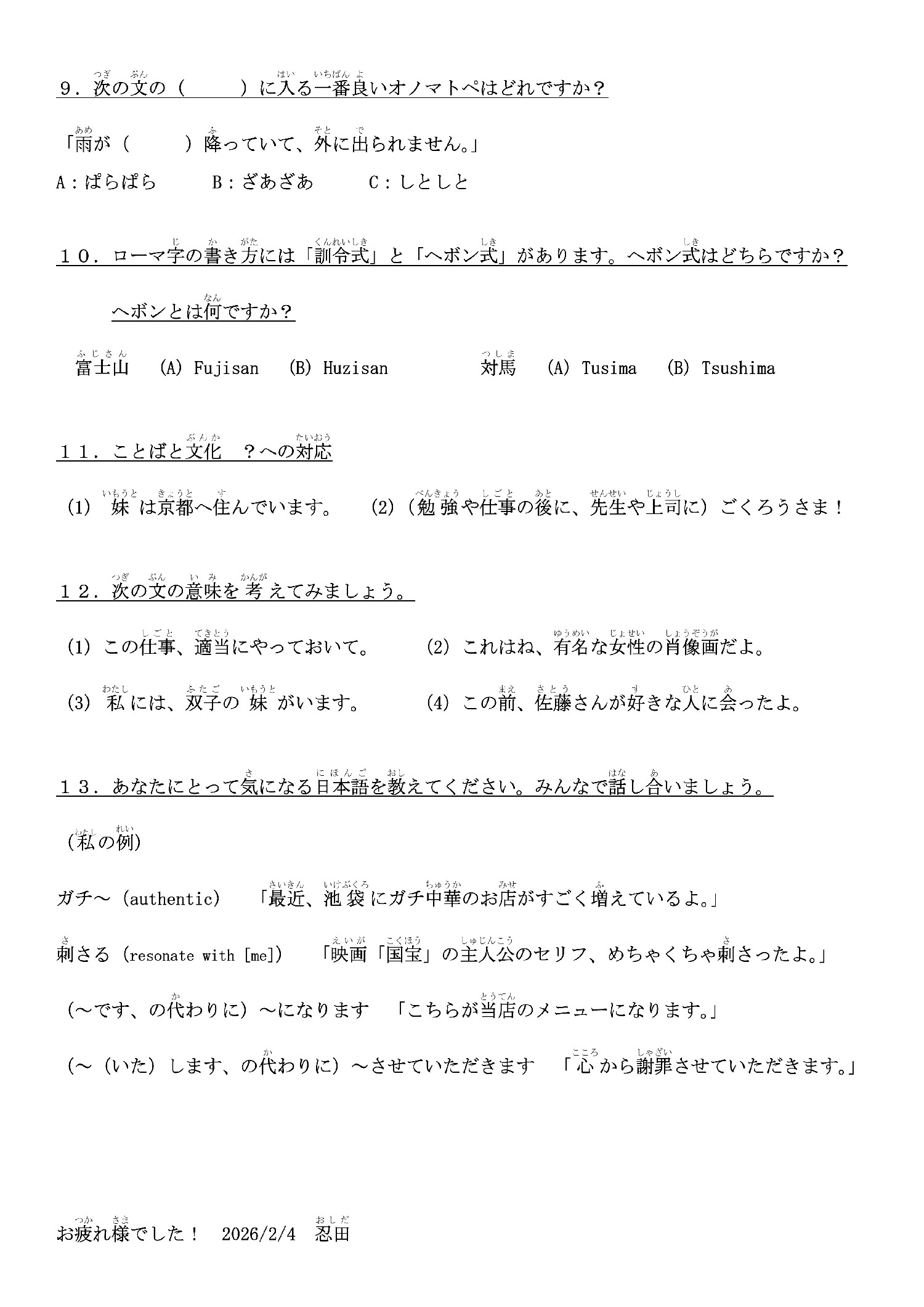 2月4日(水)の10:30から11:30までの約1時間を使って、「みんなで考える日本語クイズ会」を実施しました。このクイズ会は参加型と銘打ち、できるだけ学習者に発言してもらったり、板書してもらったりして、にぎやかなひと時となりました。日本語能力試験ではないので、答えが一つとは限らないものも含めました。学習者が隣のボランティアに質問を確認したり、一緒にあれこれ考えたりする様子が見られました。 クイズと言ってもイメージが湧かないかもしれませんので、当日配布した資料をご覧ください。日本語学習者のみなさんにとって文法や漢字は難しいと言われますが、それだけでなく、カタカナ表記やオノマトペにも迷うことがあるようです。 11番の「ことばと文化 ?への対応」では、ボランティアのみなさんに、学習者の発話の「誤り」にどのように対応するかも聞いてみました。文法の誤りにはある程度寛大でいられても、文化の誤りには少し厳しく対応しているようでした。 13番の「あなたにとって気になる日本語を教えてください」については、時間切れで詳しくはできませんでしたが、日頃から、変化する日本語に対する感受性を高め、日本語の知識をアップデートすることは学習者だけでなくボランティアにとっても大事なことと感じました。(忍田記)