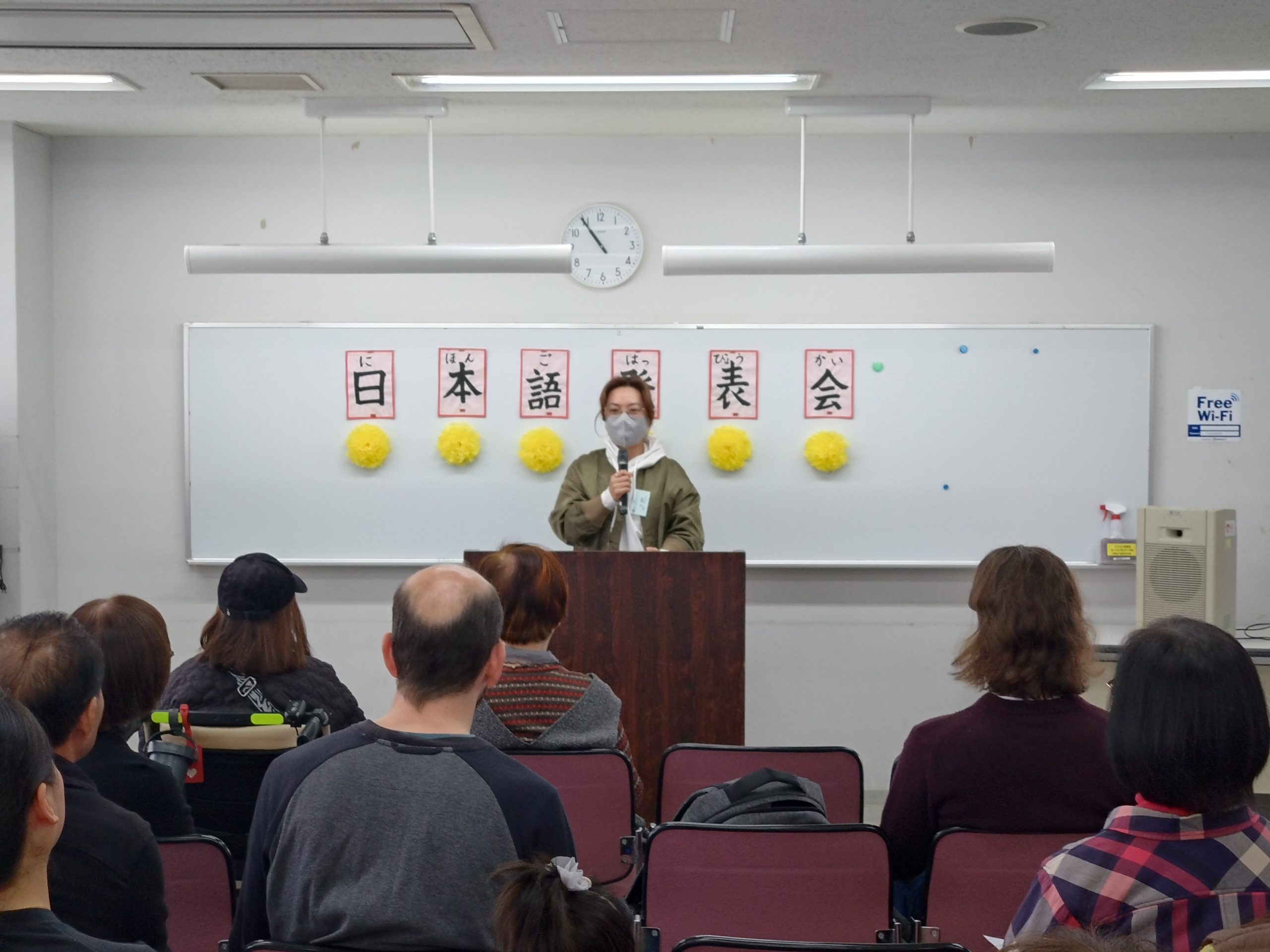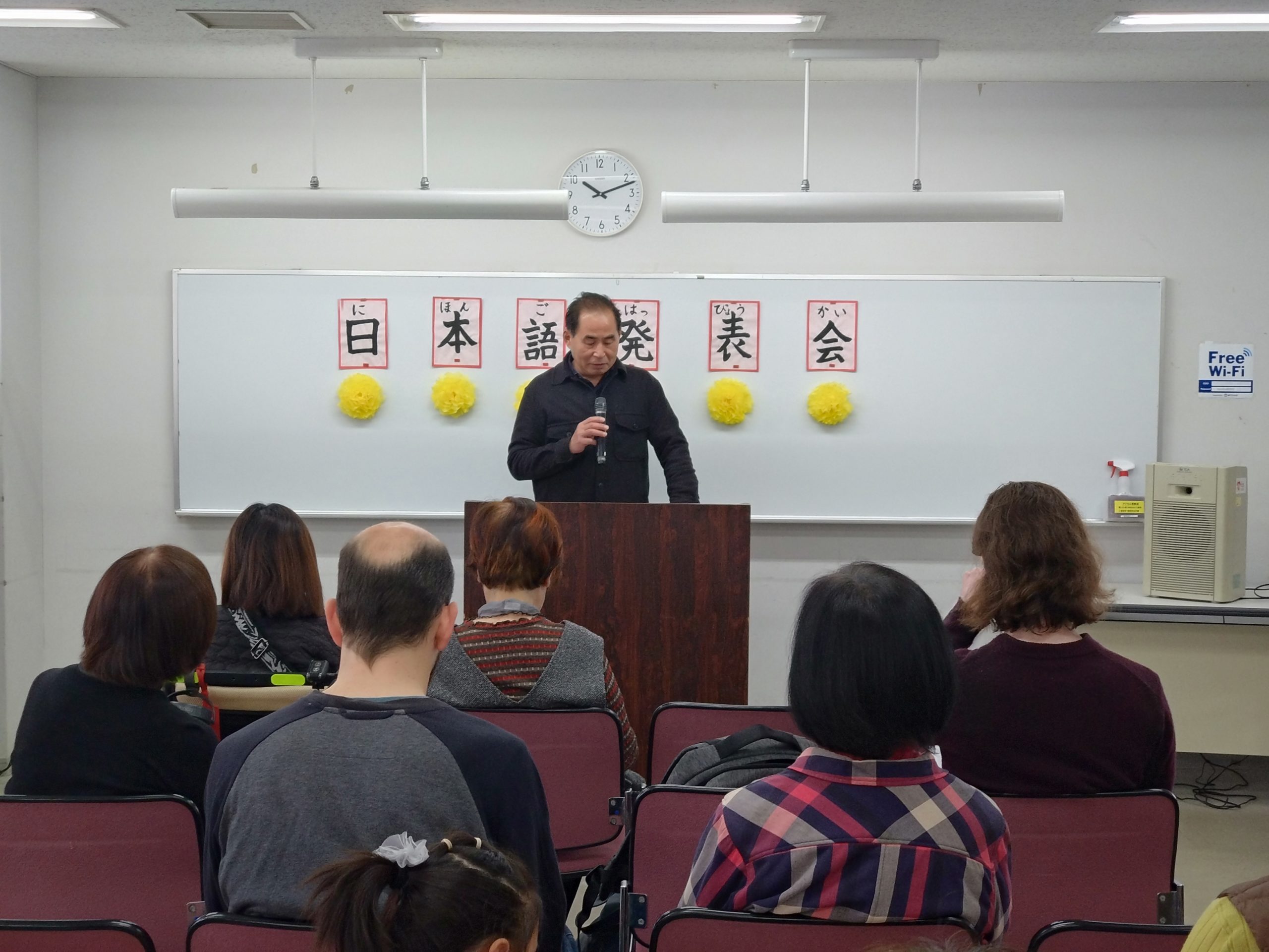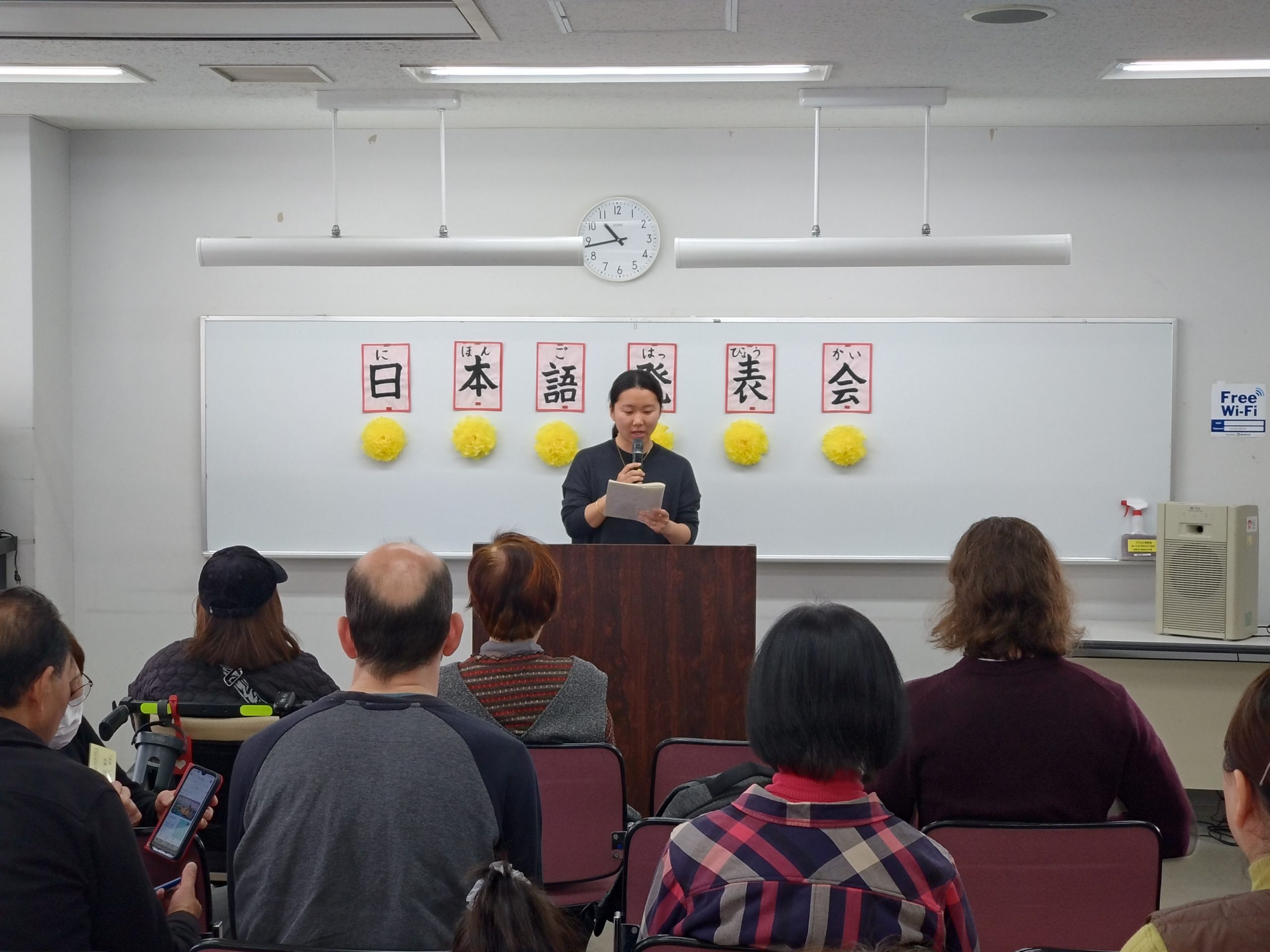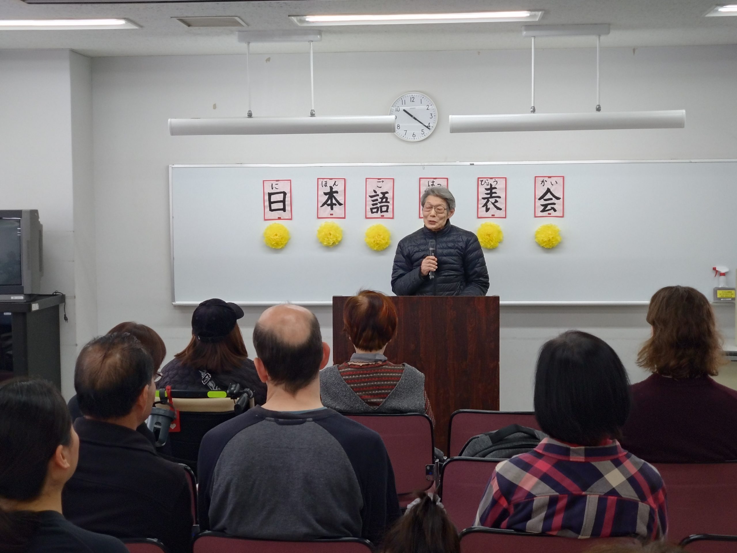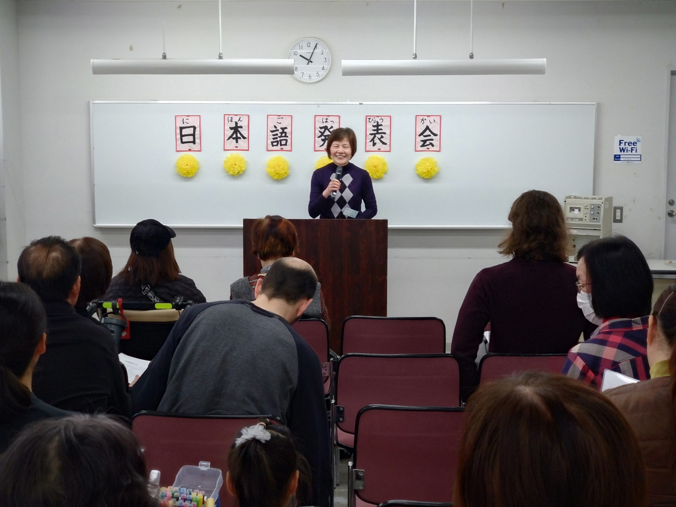 3月18日 水曜日クラスで「日本語発表会」を開催しました。この会は、それぞれの学習者が、一年間日本語の勉強に取り組んだ成果をスピーチの形で発表するものです。学習者は、ボランティアと相談しながらスピーチの原稿を作り、話す練習をして本番に臨みました。