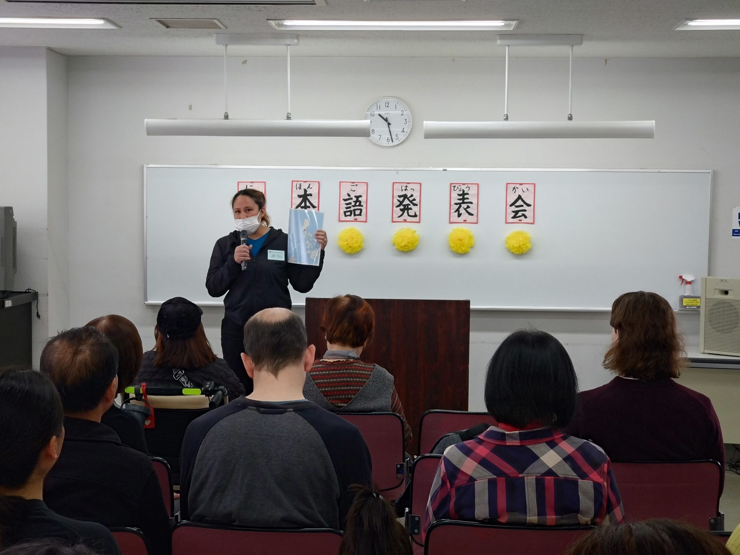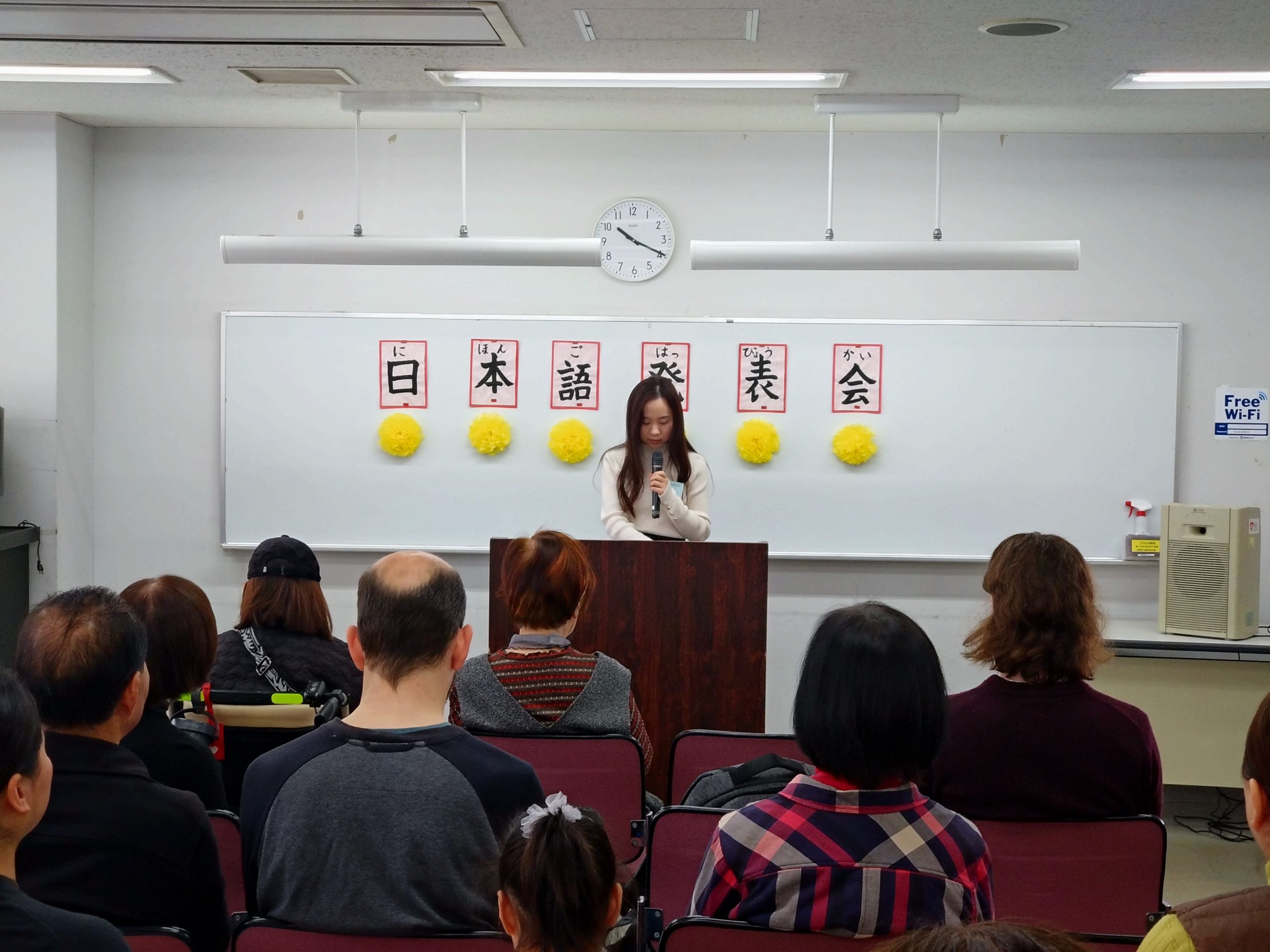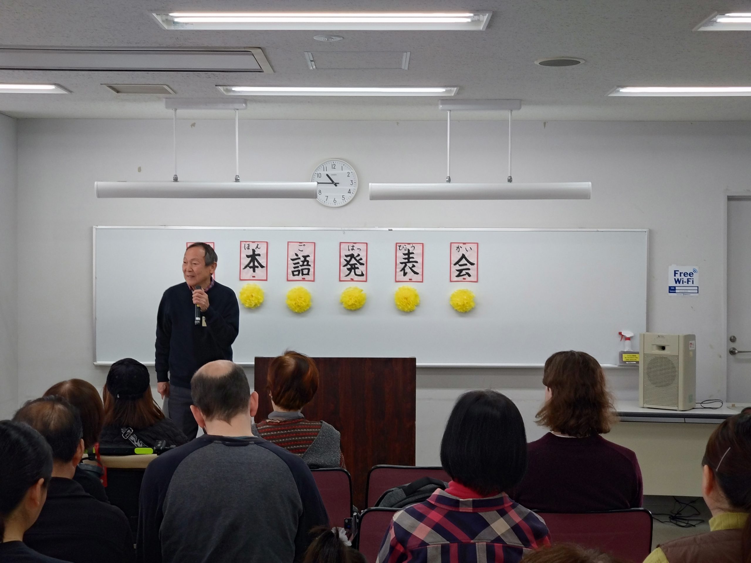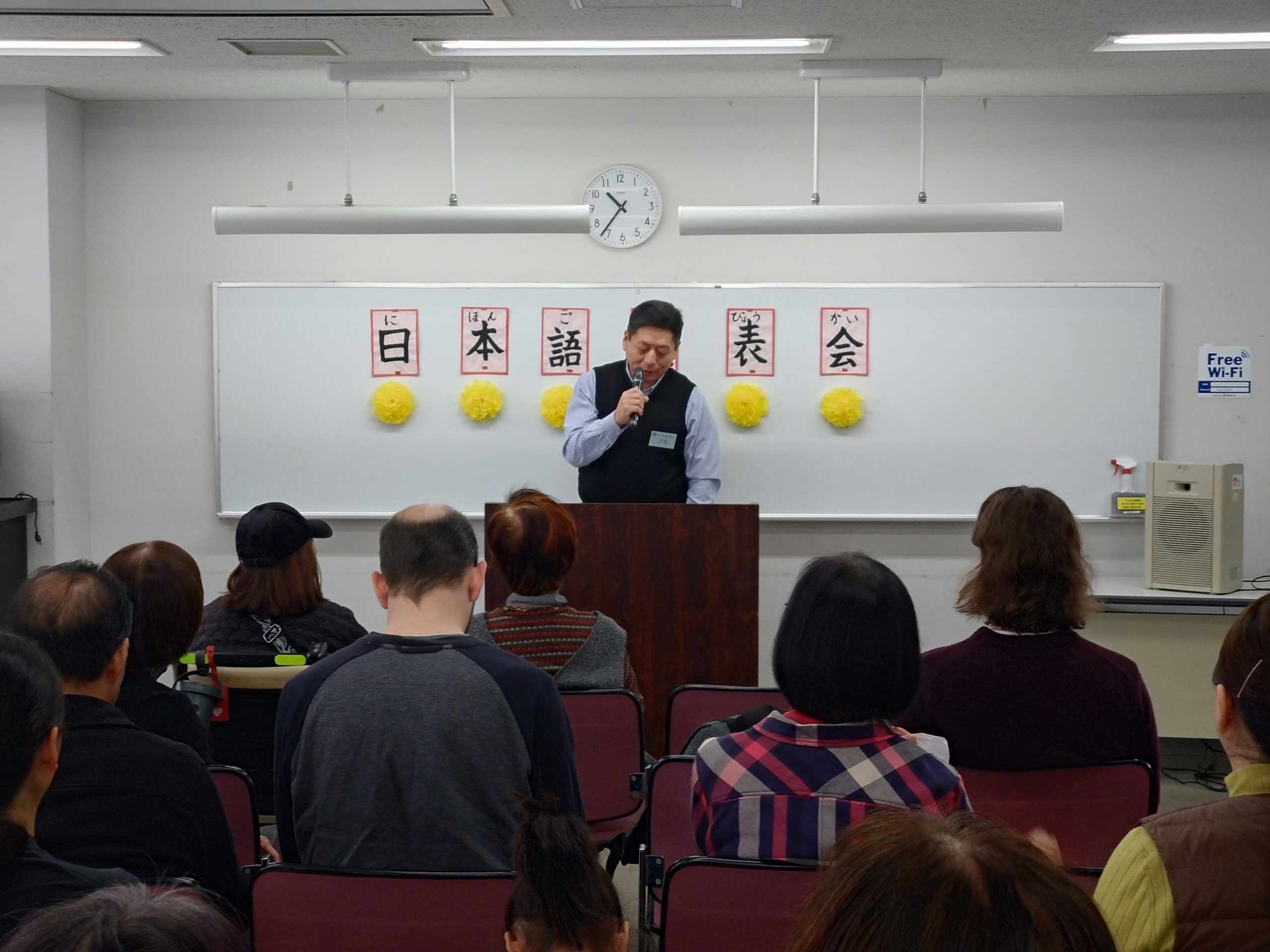 3月18日 水曜日クラスで「日本語発表会」を開催しました。この会は、それぞれの学習者が、一年間日本語の勉強に取り組んだ成果をスピーチの形で発表するものです。学習者は、ボランティアと相談しながらスピーチの原稿を作り、話す練習をして本番に臨みました。