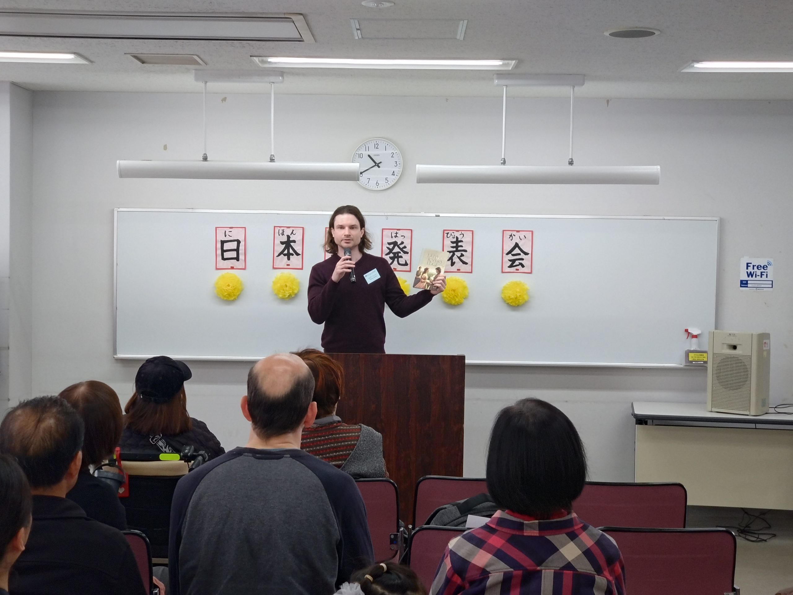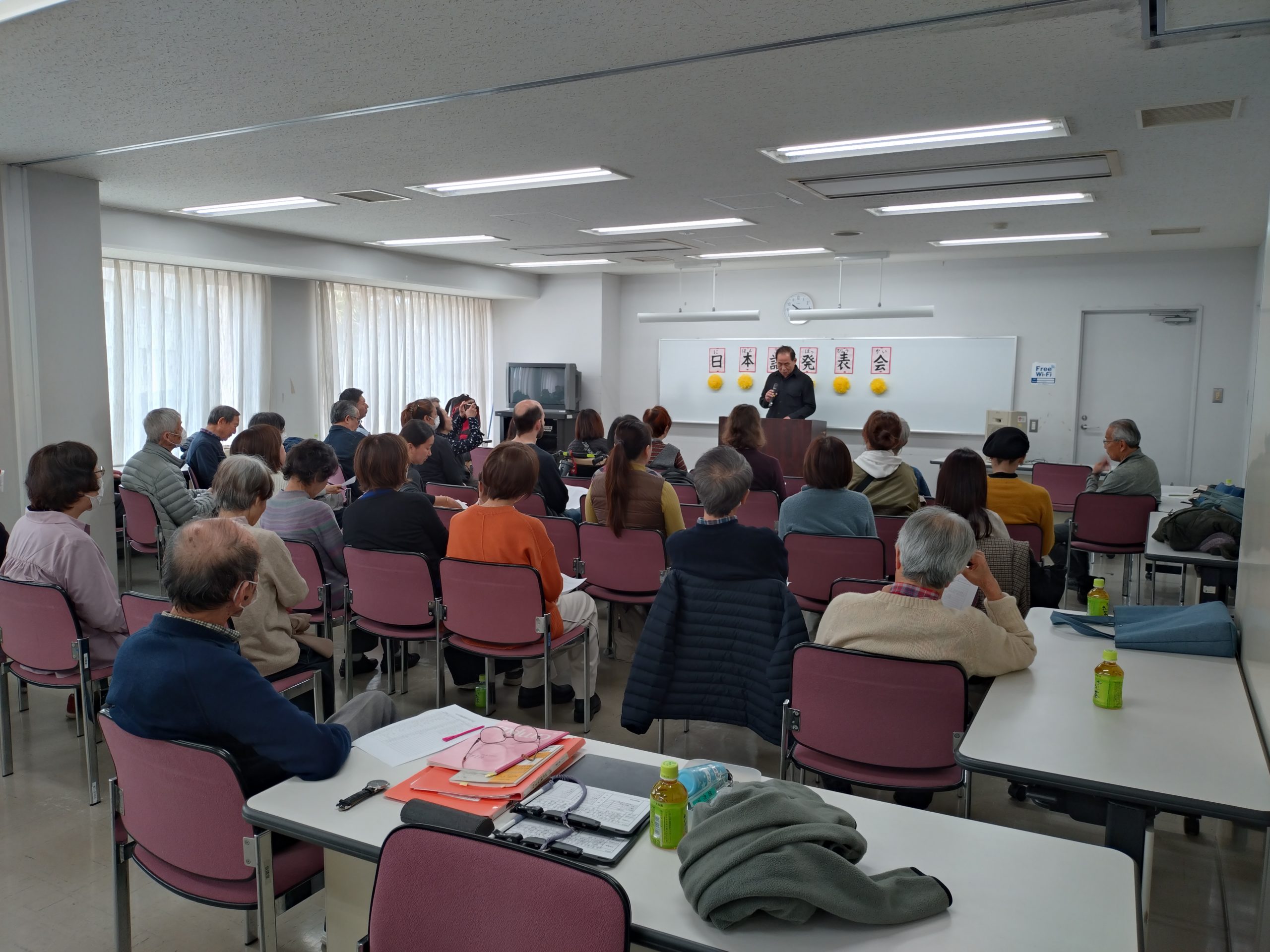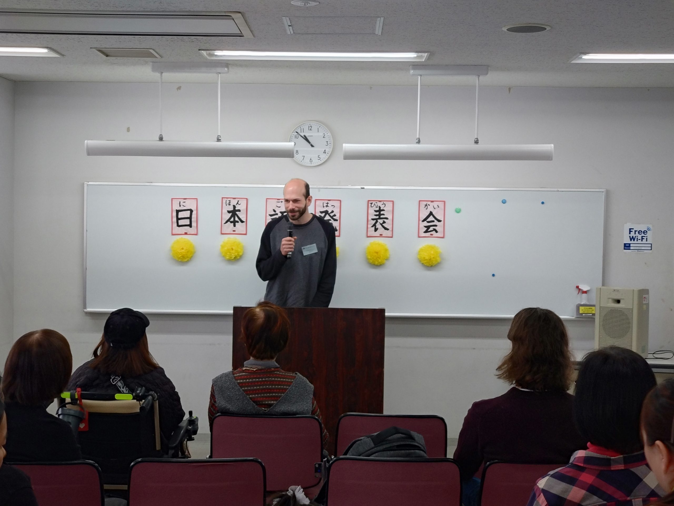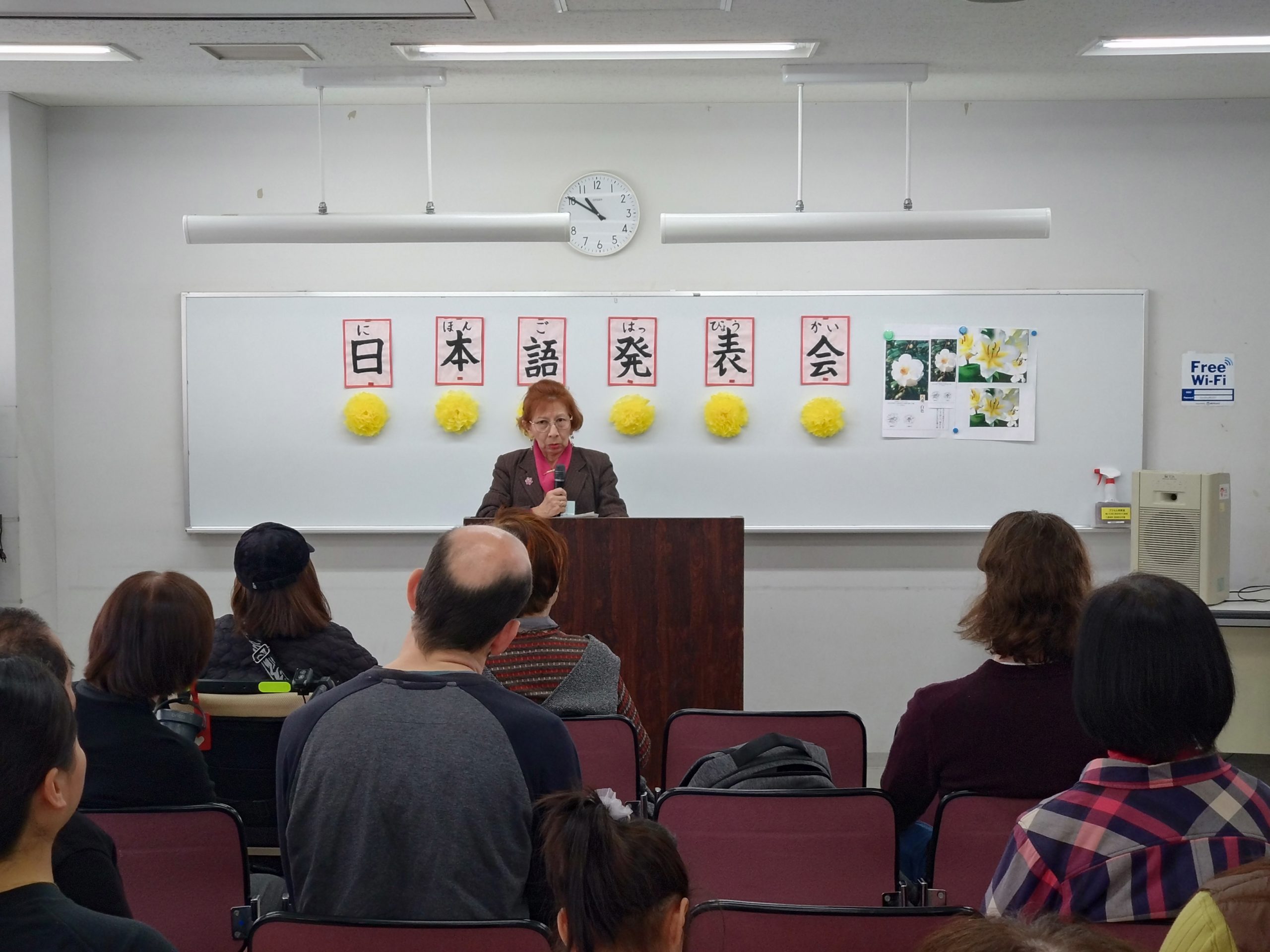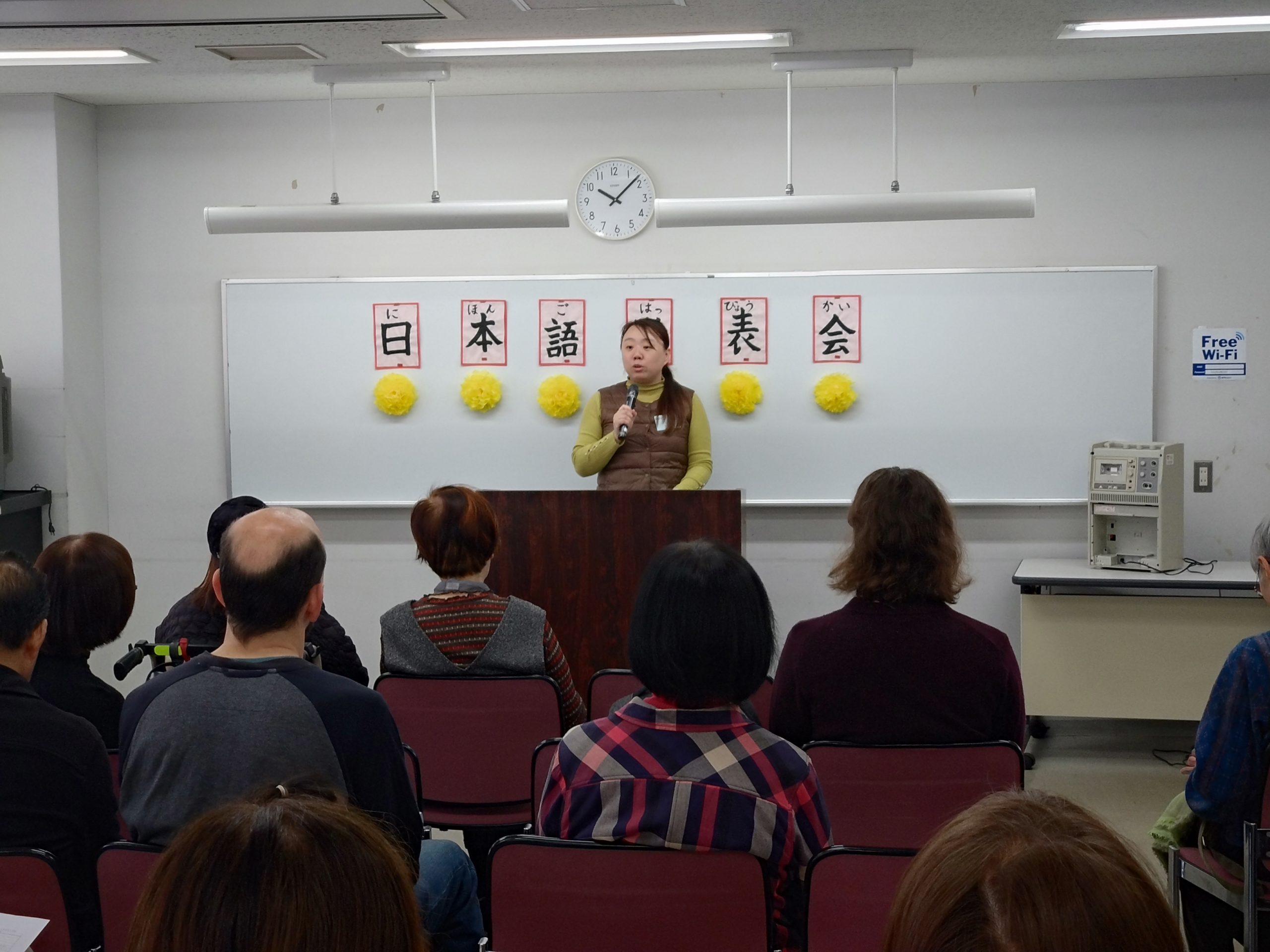 3月18日 水曜日クラスで「日本語発表会」を開催しました。この会は、それぞれの学習者が、一年間日本語の勉強に取り組んだ成果をスピーチの形で発表するものです。学習者は、ボランティアと相談しながらスピーチの原稿を作り、話す練習をして本番に臨みました。