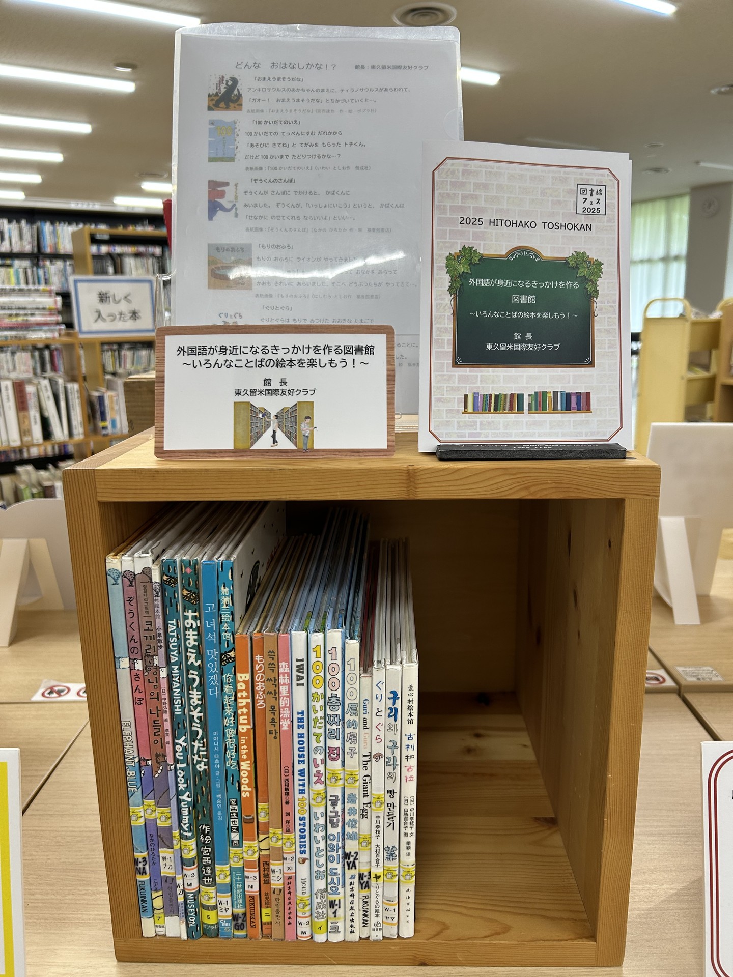 今年のテーマ「としょかん+1(プラスワン)」に添って、「外国語が身近になるきっかけを作る図書館」というコンセプトで参加しました。
