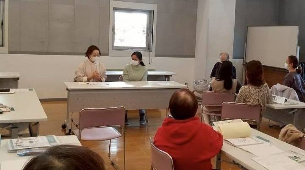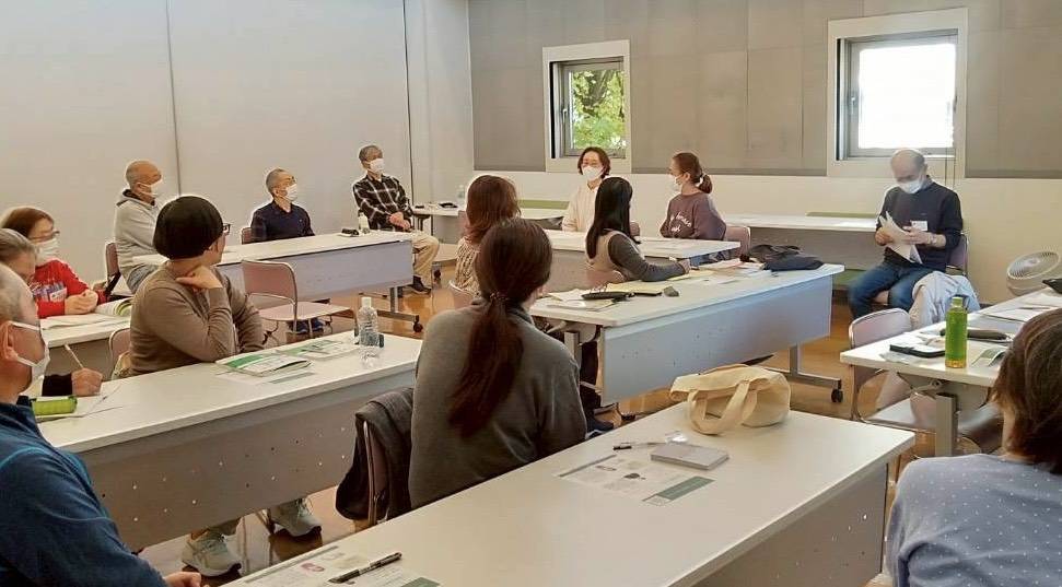 次に、野俣先生からは、今、私たちが一番知りたいと思っているグループ学習の進め方の実際をお話し頂きました。YOKEでは、週二回、日本語のレベルがばらばらの五人程度のグループで、サポーターが用意したテーマに沿って話し合い活動をするというものでした。そこで、先生は研修の参加者に、模擬の話し合い活動を提案され、早速、グループに分かれ、話し合いをスタート。どのグループも時間を忘れる程、盛り上がりました。